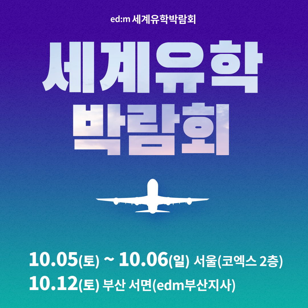 *박람회 일정 및 장소 서울: 2024년 10월 05일(토) ~ 06일(일) 코엑스 2층 부산: 2024년 10월 12일(토) edm부산지사 ※서울, 부산에서 열리는 2024 올해 마지막 유학전문박람회 서울,부산 모두 박람회 현장